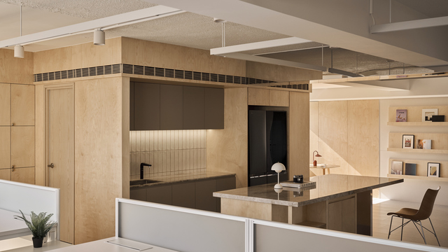七樓被設定為年輕、開放、從容的工作空間,設計上大量運用樺木夾板作為牆面和櫃體基底,搭配暖色調材質及經典家具,營造出好似在咖啡廳工作的氛圍,讓同仁能獲得視覺與心靈的放鬆,也便於拍攝或直播時取景。