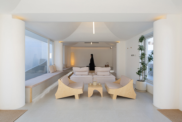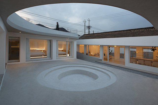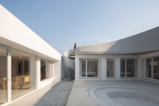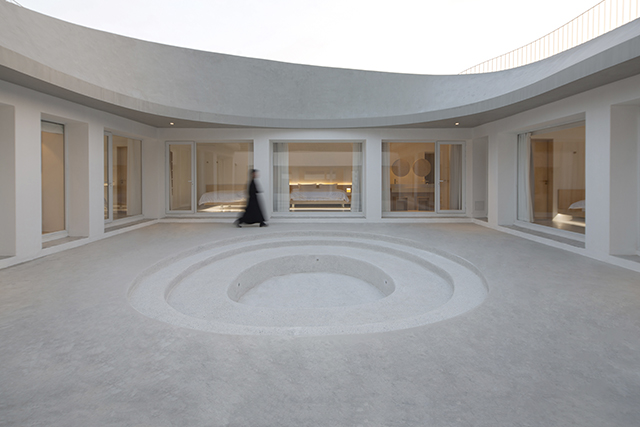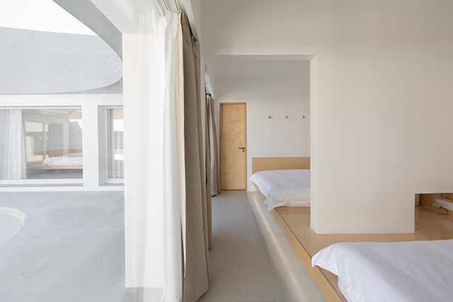 穿過前院和共享空間,安靜的後院就此展開視野,此處作為基地的「後花園」,也是整個民宿最具精神性的場域。以一個層層下陷的圓形為中心,周邊環繞個體寢區和起居機能,動線串起每個房間的大幅落地窗與遮光簾幕,提升私人使用和彼此互動的彈性;曲線屋頂和弧形牆面由室外流動至庭院上方,層層起伏,最終匯聚成半圓天篷,將天空納入民宿的端景範圍。