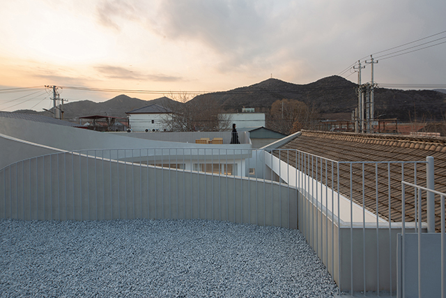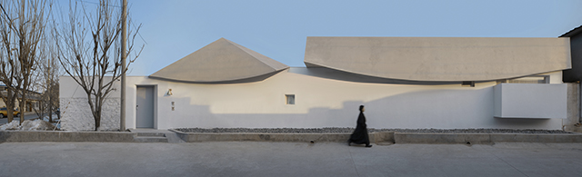 改造前的建築沿街立面因正房山牆與廂房立面高低錯落,瓷磚與塗料隨意拼接,缺乏整體感和理解在地的切入點,設計團隊透過平頂建築的樓面作為輔助線,在既有白色建築之上,加上一頂富有質感的灰色「帽子」,以新的邏輯概念整飾《京呆民宿》和周邊鄰里與遠山的關聯性,以及自身內部空間的重理,透過灰色屋頂整合原本破碎的立面,並以不規則的柔和曲線延伸入院,打造全作最具識別度的形象語彙。