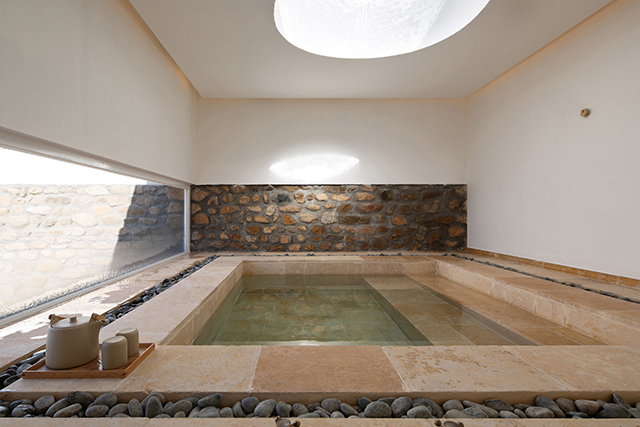 前院泡池以萊姆石舖就,以礦物特質與上方投下的天光,營造野生自然的感官體驗。