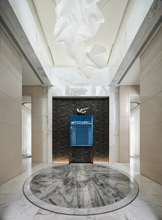 玄關牆鋪陳奢石,藉其紋理描繪「潑墨水畫」,層疊拼接如浪花推進的視覺意象,強調迎賓儀式感。