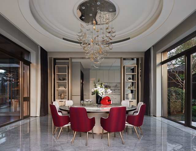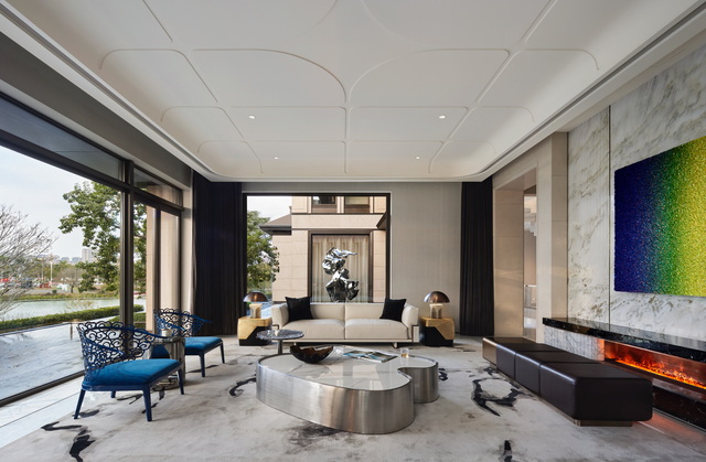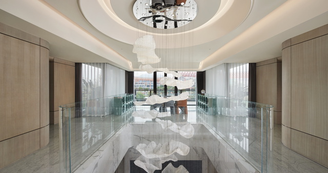 設計靈感以得天獨厚的周圍環境與當地文化為核心,如故事篇幅般層層展開。首先是「面河傍山」的絕佳景致,浩瀚水岸與翠綠山巒成為空間中的自然畫布;地下一樓的天井設計引光入室,將自然光化為動態的藝術筆觸,形塑「半畝方塘一鑑開,天光雲影共徘徊」的詩意畫面。設計團隊秉持藝術共生的理念,巧妙運用富有美感的天然石材,鐫鑄雋永品味,在奢華中回歸本質,讓生生不息的家族日常,成為最美的生活景畫。