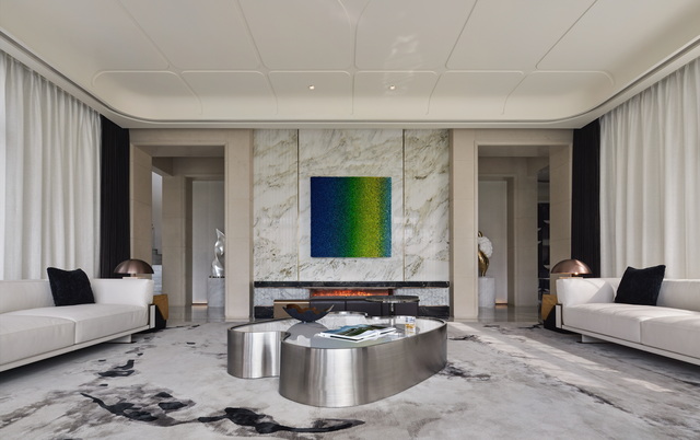 客廳主牆選用奢石,其天然紋理自成山水意境,點綴其中的刻溝線條隱喻水流,與下方石材相映成趣,予人恢弘大氣之感。