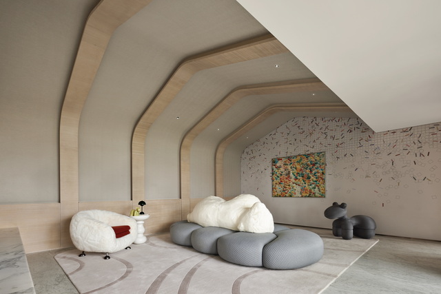 藏身一隅的酒吧,以沉穩吧台與輕盈燈光勾勒張力,引領賓客進入品鑑珍釀的秘境。另一側的家庭娛樂室則以舒適放鬆為導向,透過簡潔線條構建深具包覆感的溫馨場域,成為全家觀影、遊憩與交流的療癒之地。