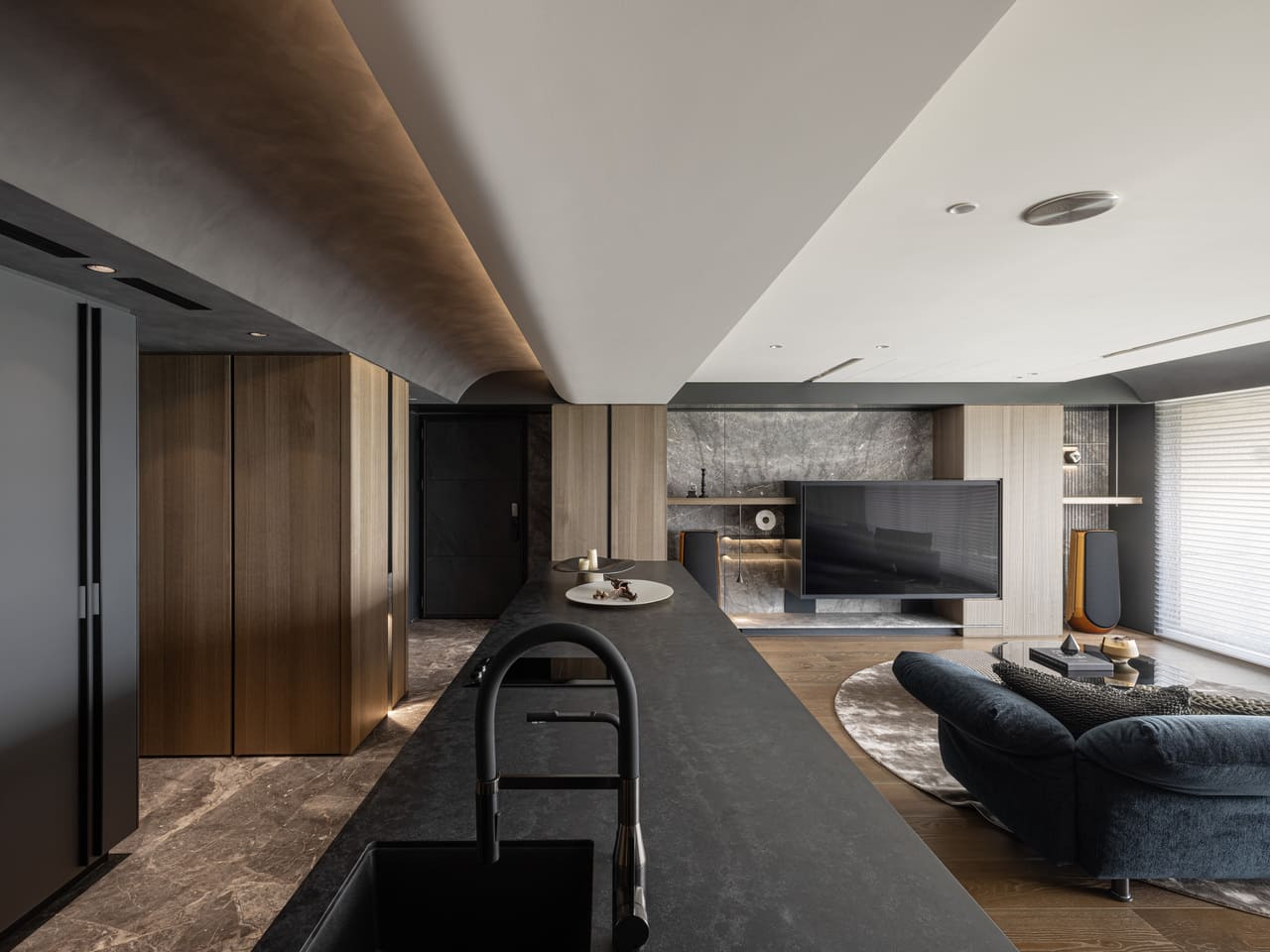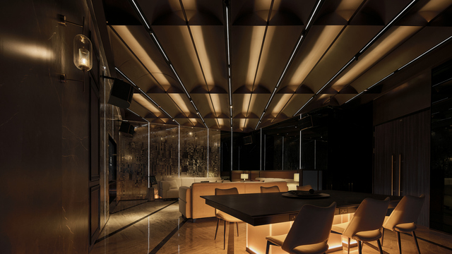「流線暗湧」大型會所沉浸於深色基調,天花以船行流水為意象,層疊流線結構包覆,光帶隨樂蜿蜒,透過暗鏡反射消融邊界,共構神秘前衛的派對情境。