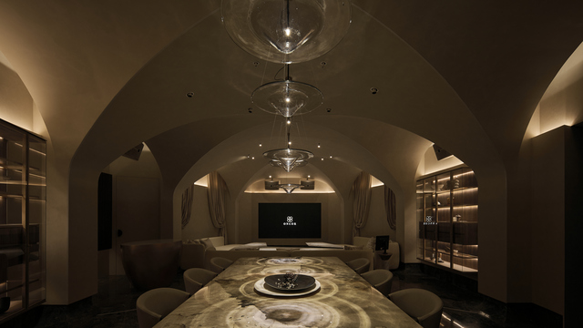 「拱頂優雅」會所展現古典寧靜之韻,以連續拱形與橢圓弧線交織出歐洲教堂拱廊意象,並鋪陳淺調塗料、大理石、溫潤木皮與金屬細節等,構築安定的儀式感。燈光沿拱形結構形成柔和迴旋光路,巧妙融入吸音布幕,予人純淨的聽覺體驗。
