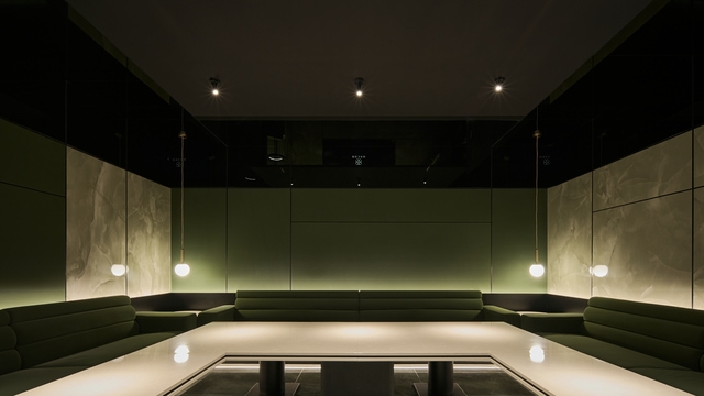 綠色包廂瀰漫著科技感與神秘氣息,黑鏡材質延伸至上牆及天花,線性燈帶穿梭其間,形塑彷彿科幻電影的光影世界。