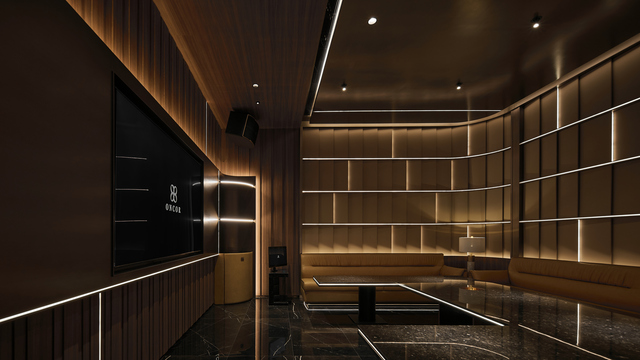 黃色包廂定調為親和包容,以層疊皮革飾板創造柔和流線肌理,板間光效隨音樂律動,於細節處見精緻。綠色包廂營造科技神秘感,上半部與部分天花採用黑鏡,結合直線燈帶構建科幻光景;設計師亦規劃「溫和模式」,關閉線燈即可轉為寧靜溫馨氛圍。所有包廂均整合展示收納功能,並嚴選高吸音材料確保聲場獨立。