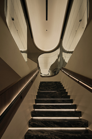 作為情緒開端,周圍細碎的鏡面映射璀璨光影,沿著樓梯而下,感受由明漸暗的場景轉換,形塑充滿儀式感的感官體驗。