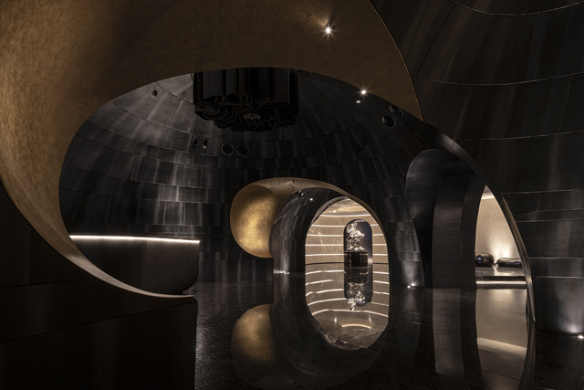 「情緒的開端」始於一段沉澱路徑,從廣場喧囂沿樓梯盤旋而下,空間由明亮漸次收束,推開深色木皮眼前驟變,樓梯間的細碎鏡面鋪天蓋地,將光線折射成璀燦星霧,創造充滿儀式感的視覺界線,劃分出日常與非凡的情境轉折。穿越鏡像隧道,接待大廳豁然開朗,以「連續洞穴」為核心,巨型橢圓量體交錯切割,塑造流動的弧形場域。牆面金屬質感膜料化解曲面難題,同時調節聲波反射,佐以天花吸音布幕,完美平衡美學與聲學,創造獨特迴響與舒適的聽覺饗宴。
