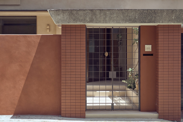 外牆塗上紅磚色澤以保留老屋語彙,同時以鮮明調性聚焦視線,搭配一道方格鐵件門輕巧劃分內外,在穿引視線的同時,亦細膩界定場域。