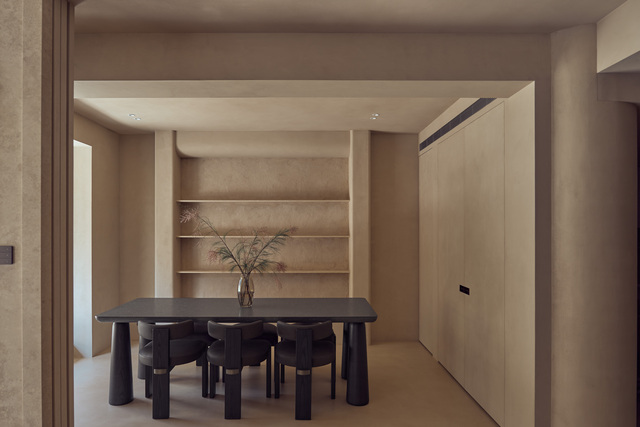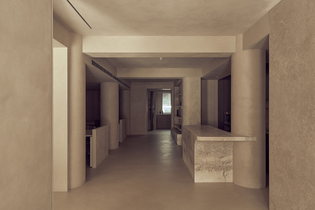入口玄關是空間給予的第一印象。一道略轉斜角的大門,創造一個含蓄的視覺轉折,避免室內一覽無遺;廊道兩側對稱的圓柱以溫潤弧線迎接訪客,從伊始便奠定空間的柔和語彙。設計師以相同色系為紙,不同質感為墨,在此展開靜謐的層次敘事。大理石的天然紋理與凹凸肌理,與一旁質樸塗料牆面形成微妙對話,塗料自有其細膩肌理,然而色澤更顯純粹內斂,沉澱了初入空間的心緒。這種以材質紋理取代色彩變化的邏輯,在此處延伸至每個角落。