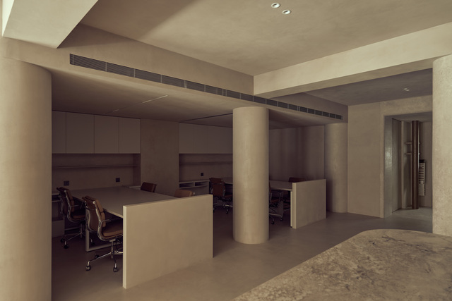 員工辦公區的規劃,體現了在開放與隱私間的巧妙平衡。場域被規劃於動線一側,以統一色系與材質低調融入整體環境,避免訪客視線被直接干擾。因應這棟50餘年老屋的樑柱結構,設計師降低天花板,並將設備整合於此,以維持公共區域的高挑與純淨。特別的是,每個座位上方配備可獨立調節亮度的個人燈具,賦予員工自主控制微環境的彈性,營塑安靜而專注的氛圍。