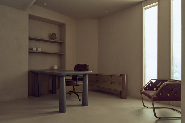 設計師的私人辦公室,是整體設計哲學最個人化的呈現。空間延續外部材質語彙,但更為素淨內斂。一張以溫潤塗料處理的弧形辦公桌,與會議室主桌造型呼應卻更顯低調。最引人注目的是,設計師將原有高窗改造,設計兩扇從天花板延伸至地面的垂直長條窗,向下開出窄長窗景,當光線自此灑入,在牆面上拉出悠長光帶,不僅重塑牆面比例,更在視覺上將空間向上拉伸,塑造靜謐而富有精神性的沉思角落。這扇窗實現了其受建築大師安藤忠雄啟發的夢想,成為空間中最動人的光影詩篇。