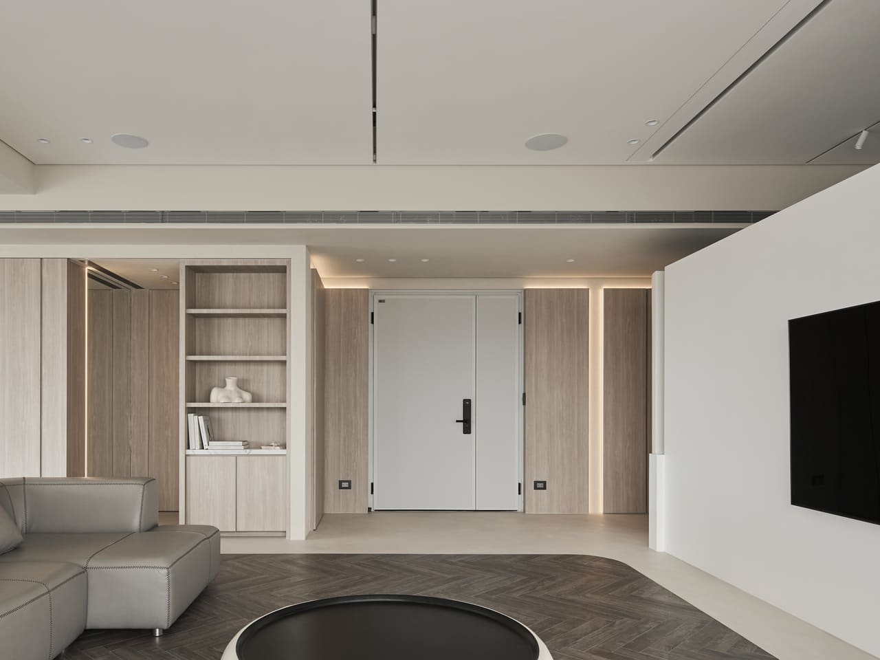 電視牆刻意以上下懸空的形式突顯輕盈感;門片可依據情況彈性開闔。