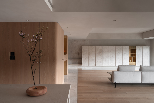 整體氛圍以女主人的性格為核心發想:重視品質、含蓄而不張揚,有鑑於此,質感並非來自複雜語彙的堆砌,而是一種對極簡明快的追尋。材質鋪陳回歸節制,避免過度裝飾,利用塗料、淺色橡木與安卡拉灰大理石作為主要基調,石材凹凸紋理細膩、深淺適宜,遠觀不喧嘩,近看富含韻味;而業主偏好的「金色元素」則利用黃銅進行詮釋,隨著時間氧化的過程逐漸映照生活痕跡,成為室內低調卻耐人尋味的表情。