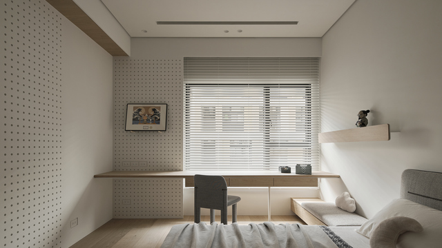 私領域的設計緊扣居者個性,孩童房以臥榻跟沖孔板保留自由發揮的彈性,主臥室則以繃布營造柔雅安定的休息環境,主臥衛浴沿用安卡拉灰石材,形塑一致且沉靜的感受。