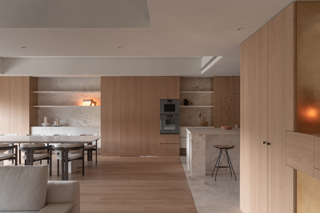 而神明廳則是全案最關鍵的轉折,設計師刻意避開傳統神明桌的制式型態,改以櫃體與牆龕的方式回應需求,並在符合文公尺的前提下微調抽屜比例,讓量體更和諧地融入空間中;同樣以木皮、大理石與黃銅作為構成的主要語彙,使其自然嵌入公區中,不僅託付了信仰,更象徵家族情誼的連結起點。設計師說明,牆龕的意象被延伸至如電視牆、中島和半高櫃的內凹造型中,形成一種隱約的結構關係,材質的轉折層次讓分屬不同機能的量體在視覺及比例上亦能相互對話。
