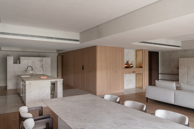 設計師分享,居住成員為一對夫妻與兩名子女,家庭組成單純,但有頻繁宴客之需求,因此公共空間需要承載多重使用情境;再加上必須設置神明廳,使本作在機能之外,更涉及信仰及日常如何共存之課題。對此,設計團隊並未試圖以隔間或造型解決問題,而是回到平面與比例本身,重新梳理家宅重心。