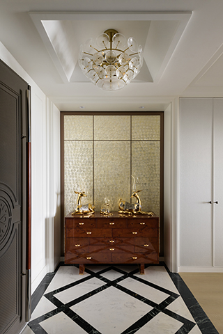 玄關是阻隔外界紛擾與家內寧靜的過渡。設計以對稱構圖與穩重的幾何地坪,築起富儀式感的入門景深。深色木質邊櫃與黑白石材的對比,低調提升整體質感。圓形穹頂天花下,一盞玻璃球燈灑下勻淨光暈,溫柔覆蓋端景藝術品,側牆隱於無形的收納,則確保視野的純粹,悄然預示室內靜謐而富有內涵的風格色彩。