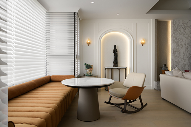 客廳作為家的核心,融合了「現代」的簡潔與「古典」的韻味。連續弧型拱門與層疊天花線條,柔化建築骨架,並將窗外的河景與綠意,如景畫般納入空間。電視牆選用紋理如潑墨的山形大理石,其渾然天成的氣韻,與整體柔和的米灰色調和諧相融。白日,天光透過落地窗滿溢室內;入夜後,嵌燈與間接光源交織出溫潤光影。家具選用線條簡練的皮革沙發,而電視牆下方一道整合線路的古銅色金屬細槽,則將機能收束為精緻細節,體現美學與實用的並存。