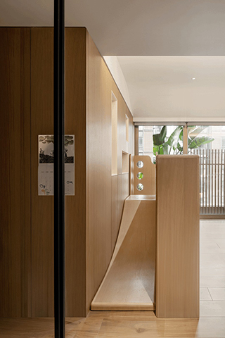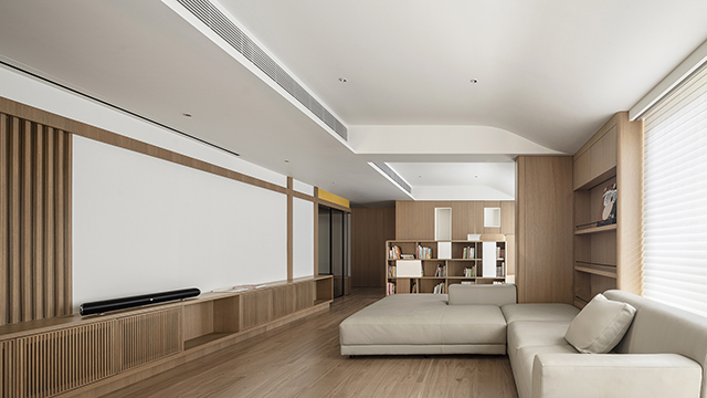 考量到三個孩子的成長階段不同、性格也各有差異,設計師以關照孩子們的需求作為思考重點,不僅預留開闊的活動空間,同時立面轉折的銳角皆經由圓潤處理,呈現飽滿的曲弧線條,確保孩童居家活動的安全,而依循長形空間打造曲線和緩的天花板造型,宛如小丘起伏的坡度,不僅拉高整體視覺,也營造富有溫度的生活畫面。