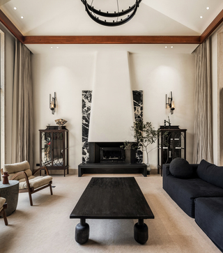客廳壁爐兩側飾以黑底白紋大理石,以及對稱壁燈,黑白底色奠定雅緻基調,同時藉家具纖細的木作曲線捎來法式風情。