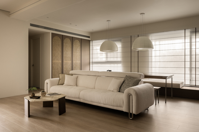 設計上以「韻」作為線索,並非以抽象概念詮釋,而是藉由身體在空間中的感知逐步累積。木作門片細緻的線性雕刻和材質轉換形成豐富的立面層次,藤編恰如其分地出現在門片或櫃體局部,在現代簡約的結構中留下一抹人文溫度,鋪敘含蓄而內斂的氣息。自然光沿窗入室,經由柔光窗簾過濾後徐徐散開,如同墨色在宣紙上暈染般,溫潤不張揚;局部點綴的弧形元素令光線在不同介質間流動和轉折,堆疊細膩的明暗變化。