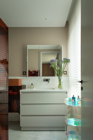 次衛浴的陳設多採用半透明的材質,讓空間更顯得通透而不擁擠,同時便於採光流通。