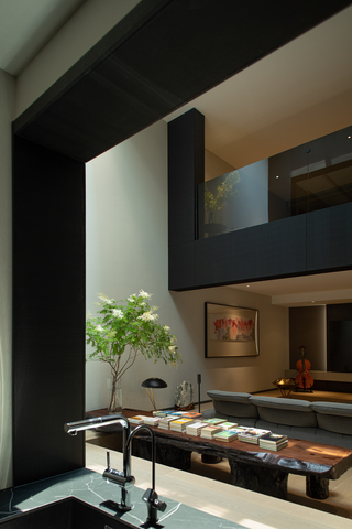 下沉區的沙發以塊體形式構築,不僅提供柔軟舒適的坐臥體驗,也在無形中劃分出活動邊界,此處既是閱讀、觀影與獨處的私密角落,也是家人與友人聚會、交談與共享時光的開放客廳,空間的角色隨著使用者心境自由轉換,模糊了功能的單一界定,使生活得以回歸本真狀態。黑色木飾面自地面向上延伸,勾勒出地下空間的主要走向,並引導視線向挑空中庭聚焦,與淺色牆面形成鮮明對比,令空間層次更顯立體而富節奏感。