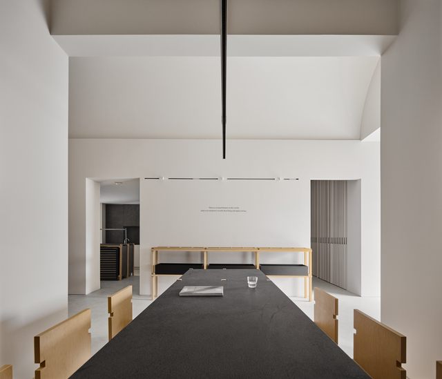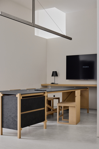 為更立體地支撐與呈現岩板質感,設計結合木作打造多樣家具量體,如長桌、座椅、洗手台、階梯踏階等,散布於不同場景之中,這些木作結構宛如立體拼圖,與具雕塑感的空間形體相互呼應;此外,岩板紋理與木材自然色調亦成為空間中唯一鮮明的色彩層次,營造出低調而富深度的感官體驗。