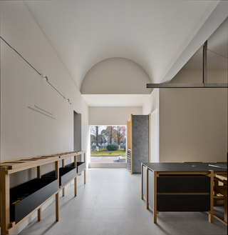 天花拱頂抬升視覺高度,結合落地窗營造的端景,橫貫長廊,在開放式的設計中區分不同展間的出入,同時串聯其空間關係。