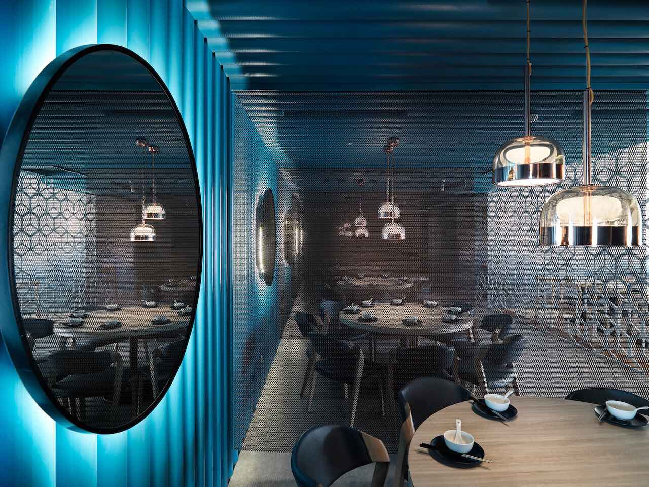 座位的規劃是此案的一大重點,分別是:活動拉簾座位區、開放座位區、卡座區以及包廂區4大區域。穿過接待櫃檯,首先進入活動拉簾座位區,延續入口處的藍色線板背牆設計,圓形鏡與燈光的設置延伸滿月意象,此區規劃6人座位,並以活動式簾幕作間隔,同時是客人最愛的座位區。
