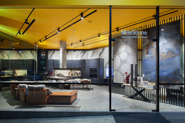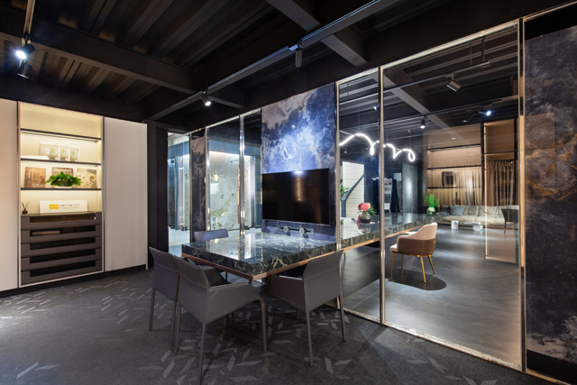 斥資千萬的台北展示間,將原本傳統的石材廠打掉重練,華麗變身時尚歐風的嶄新門市。磅礡迎賓的是入口處巨幅的「海洋之心」和最新的「HOLOS 設計款」。前者展現天然石材中最珍稀的藍色紋理;後者以最新數位印刷技術重新詮釋古老的馬賽克技術,精彩呈現 INFINITY 鈦鋼石超大薄板的震撼視覺。