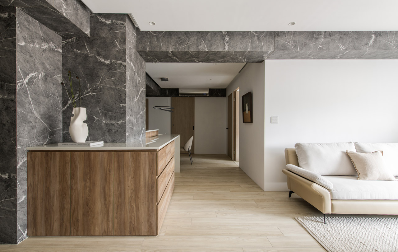 愛克板的石紋如水墨暈染,在潔白牆面中注入柔和動態。