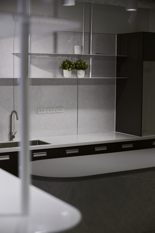 茶水區的防濺板則選用義大利塗抹風格的愛克板,搭配石紋中島檯面,低調中藏有細節。「整個空間的材料幾乎都不反光,所以這裡刻意選擇反光的板材,也暗示使用者這是好清潔的材料」。