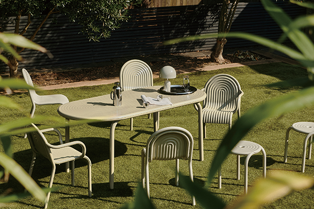 Tom Dixon 首度推出戶外家具Groove系列,將裝飾藝術的語彙轉化為戶外空間的雕塑設計。系列以高性能的壓紋鋁材製成,經粉末塗裝處理,耐腐蝕、耐候,兼顧實用與環保。包含長桌、座椅與凳子,並可搭配專屬靠墊,方便堆疊收納。提供Moss苔蘚綠、Putty淺暖灰雙色,與植栽和諧融合,襯托都會景致。(潤舍 生活家居)