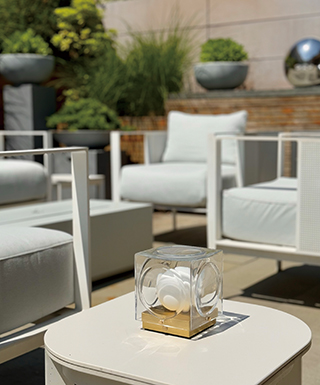 Chant桌燈是Lee Broom首款可攜式照明作品,靈感取自1970年代建築常見的玻璃磚。以手工吹製玻璃打造出雕塑般的立體外型,方形幾何結構與圓形凹槽圖案呈現視覺對比,重新定義便攜燈具的格調與美感。具備四段式調光、完整防水設計,單次充電可使用長達40小時,室內外無縫轉換。(Light Plus)