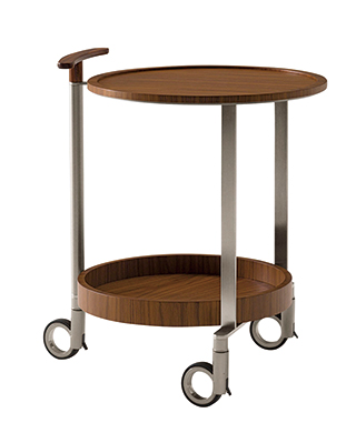 Giorgetti 的 Eos,由華裔設計師Chi Wing Lo設計。靈感源自「小托盤」,輕巧低調又能敏捷移動,宛如含蓄而不張揚的體貼助手。圓形木質托盤選用楓木或胡桃木木皮打造,搭配覆有橡膠的金屬輪,及拋光Pau Ferro握把,兼具實用與溫潤質感。(易雅居)