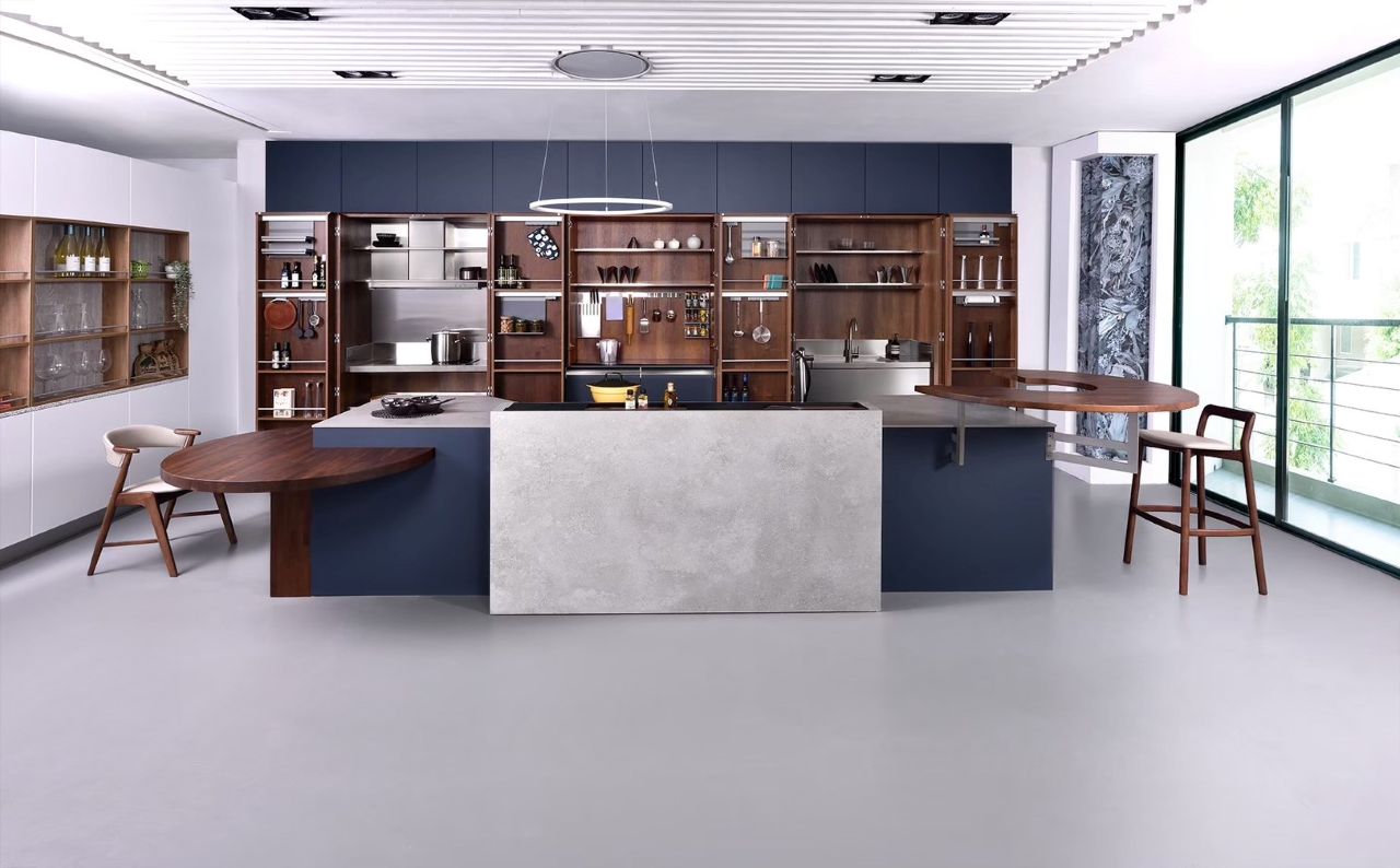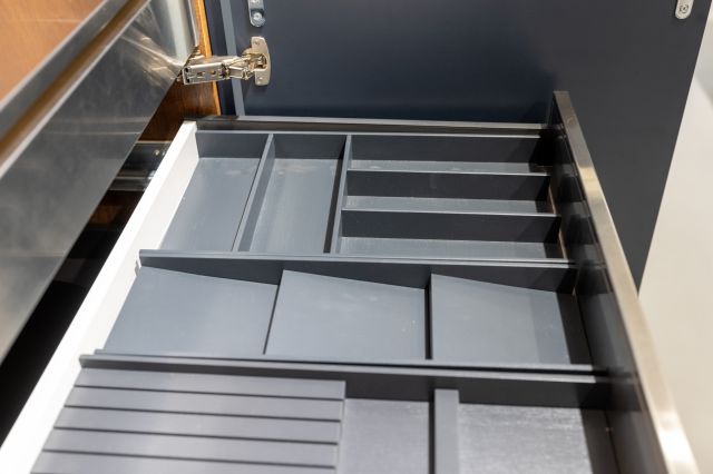 ACE 系列的 魔方工作櫃、水槽櫃與爐台櫃,整合備餐與烹飪動線,門板闔上時以頂天立地的設計打造豐富收納空間。星幻藍門板質感沉穩優雅,本身即是居家風景的一部分。開啟門板後,AvanTech YOU 薄抽系統以僅 13mm 的纖薄屜牆勾勒極簡線條,搭配分隔板、刀叉盤、收納籃等模組化配件,讓各式料理工具條理分明、動線順暢,提升整體烹調節奏與效率。