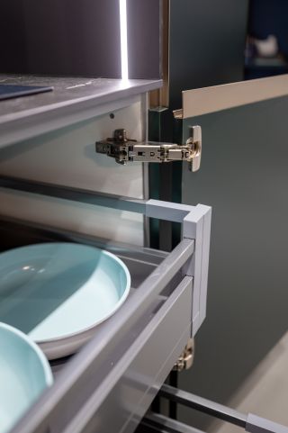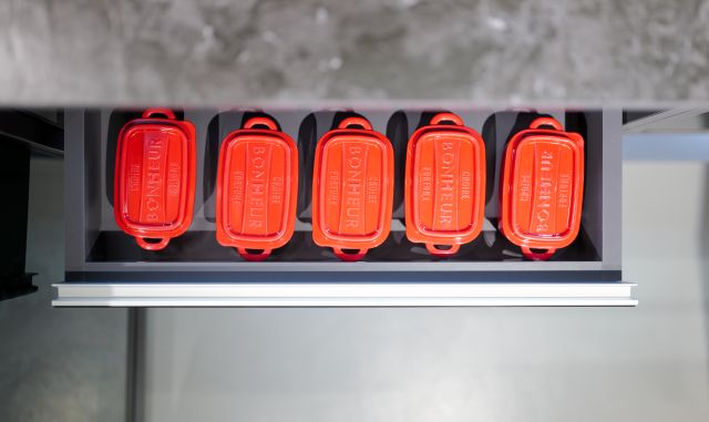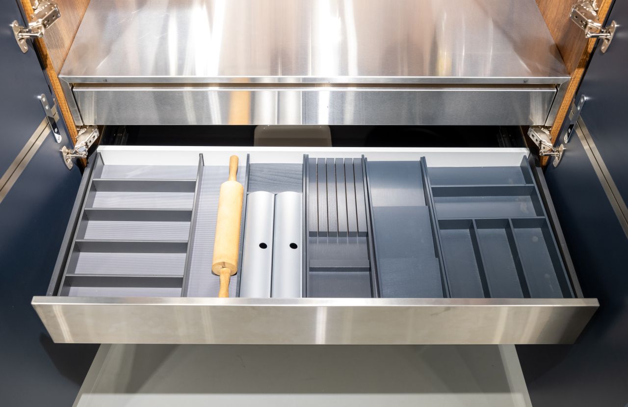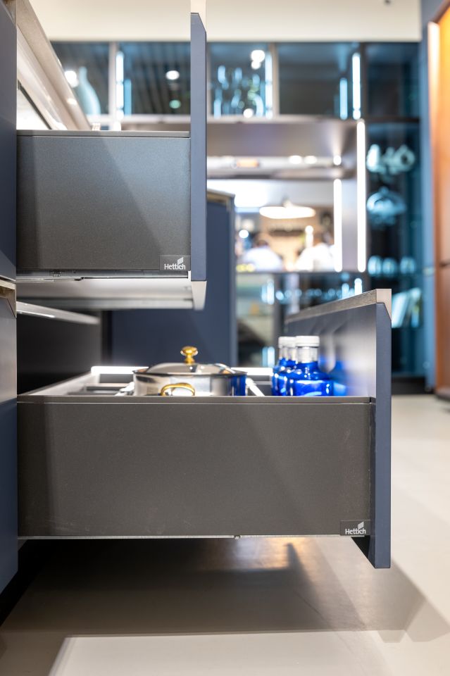 AvanTech YOU 抽屜以俐落金屬直邊呈現簡約風格,搭配 Quadro V6滑軌,即使滿載鍋具碗碟,依然輕鬆抽取、順暢滑動。義式美學與德式五金的相遇,不只打造亮麗空間,更展現令人驚豔的收納力,讓每次使用都安心愉悅。
