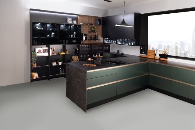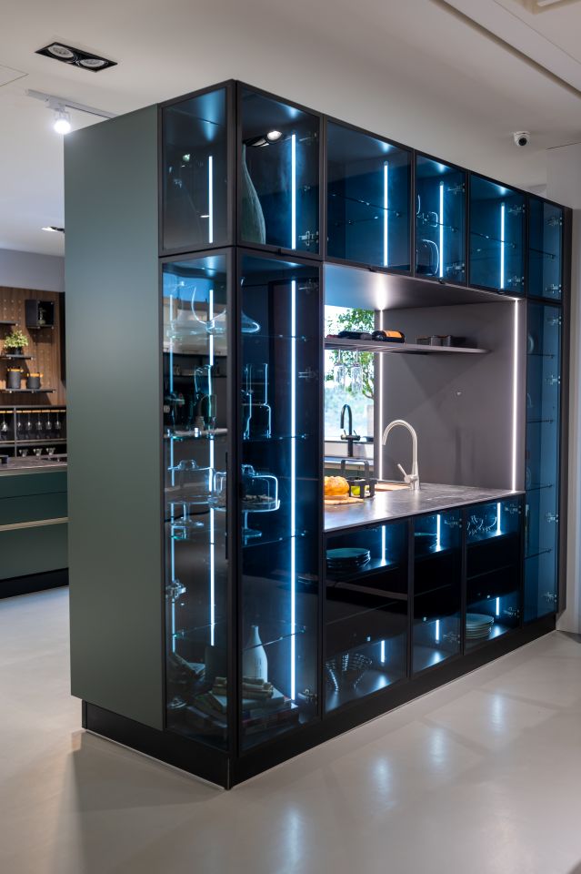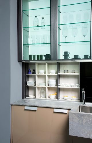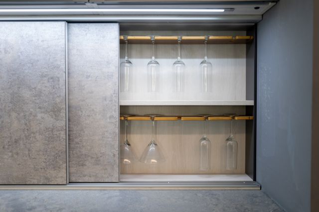 中段櫃體配備 SlideLine M 滑門系統,擁有緩衝功能,滑推輕巧、收合靜音,無論收納杯盤、調味罐或藏酒佳釀,皆能依照使用者需求靈活配置,為生活帶來更多從容自在。