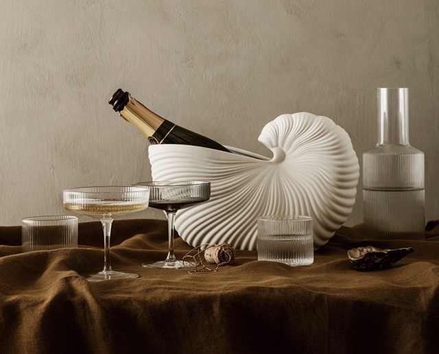Ferm Living的Ripple系列,以俐落直紋玻璃捕捉光影,讓水流傾注或舉杯瞬間都帶有韻律感。以傳統工藝壓製的輕薄杯身,展現細膩觸感與清晰線條。外型簡潔的水瓶、玻璃杯與香檳杯,因光線折射呈現豐富層次,在桌面上形成安靜焦點。(潤舍.生活家居)
