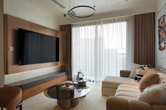 使用度最高的客廳和餐廚,承接「家」的開放表情,飾材挑選更著重呼應情感溫度與社交互動。客廳作為家的核心,當牆體、櫃面和門片間一氣呵成柔和節奏,映照出居家的秩序與平衡。低彩度色澤營造平靜柔和的氛圍;壁紙紋樣和光澤宛如柔軟背景,為牆面增添層次氣韻。溫潤色澤和質感細膩的板材構築,點綴光影流動,讓場域更顯沉穩包容。