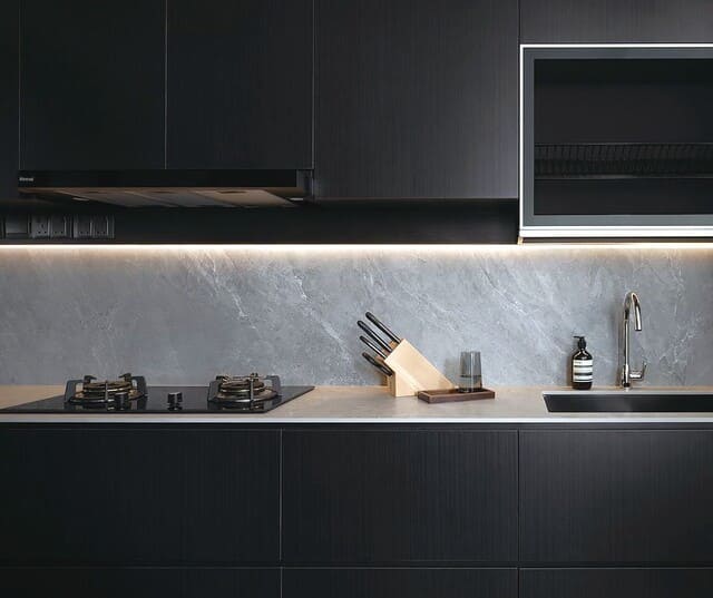 MB13安格拉珍珠的光影在細膩的灰階紋理間流動,以不張揚的姿態成為廚房中最沉靜卻難以忽視的存在。石紋層理自然優雅,與深色櫃體相互映襯,空間在剛柔之間取得完美平衡。作為高性能的表面材料,鈦鋼石耐磨、抗高溫、易清潔,輕鬆應對日常烹飪的考驗。明火炊煙或水氣濕熱,都無法掩去其穩定質地與低調光澤。(權創國際)
