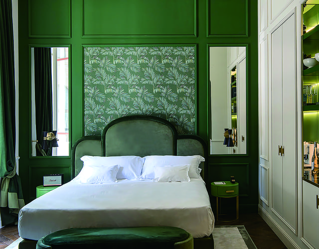 義大利時尚裝飾壁材印克(Inkiostro Bianco), 專長創意設計和個人化的客製化壁材。佛羅倫斯的精品飯店Hotel La Gemma於客房選用綠底白葉圖案,帶來寧靜與和諧,讓旅人彷彿置身心靈的避風港,透過色彩和紋理體驗美與寧靜共存的感官享受。乾濕區皆可施作,並提供數千種圖庫選擇,盡情展現獨特藝術美學。(櫻王國際)