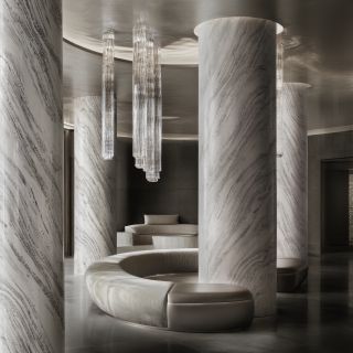 飽含大地氣息的「卡拉拉灰褐」,擁有如絲表面,觸感光滑溫潤。融合經典石材美學與流動紋理的靜謐力量,欣賞自然流動的高雅層次,內斂沉靜的表面最適合為酒店、辦公室或住宅增添舒適氣息。