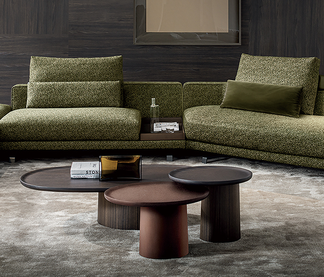 Molteni&C的 Louisa,由Vincent Van Duysen 設計。一系列的圓形和橢圓形茶几,採用實木、混凝土材質製成,富有創新的觸感和美感,以不同大小與高度堆疊層次美感。底部以圓柱形基座彷彿大樹從地面長出,支撐桌面如懸浮的托盤,讓空間產生輕盈優雅的現代美感。(卡希納空間美學)