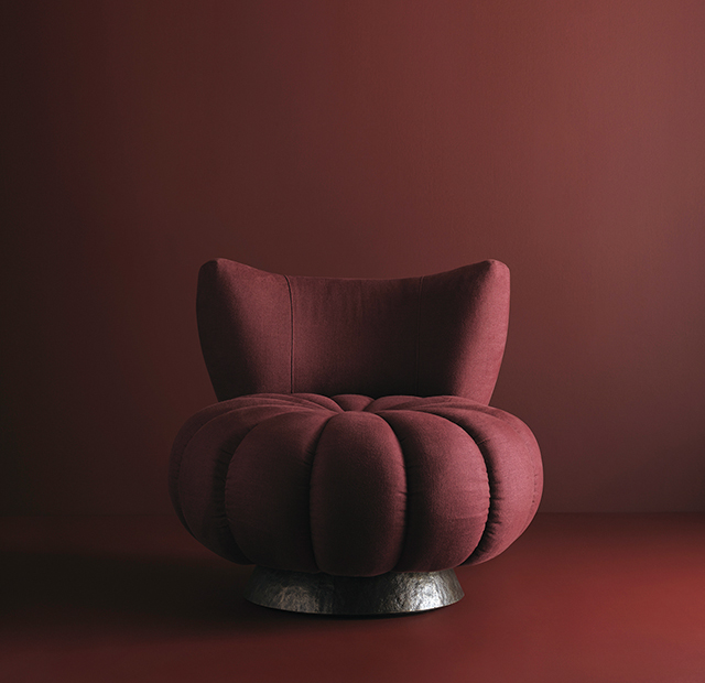 由全球奢華酒店設計師Bill Bensley設計的The Twisted Clouded Leopard Swivel Chair,靈感源自喜馬拉雅山區稀有的雲豹。其深沉飽和的波爾多紅酒色澤,散發低調奢華的氣質,為空間帶來鮮明精緻的視覺焦點。以化石黃銅質感底座,並以優雅的立體縫線拉扣勾勒柔和輪廓,成就當代設計的經典標誌。(Baker-McGuire貝克傢俱)