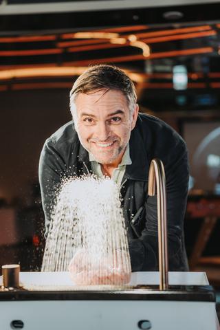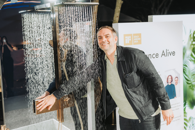 Andreas Diefenbach與「Raindance Alive淋浴系列」合影,透過「先觀察、再設計」的核心概念,為人們打造舒適的沉浸式盥洗空間。